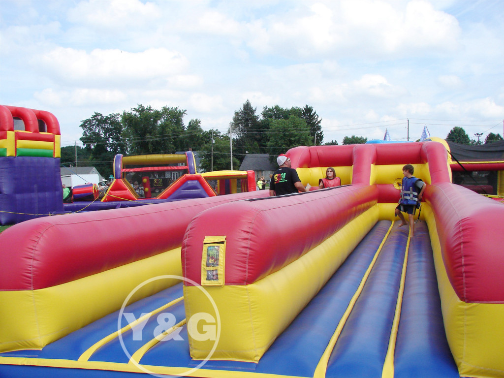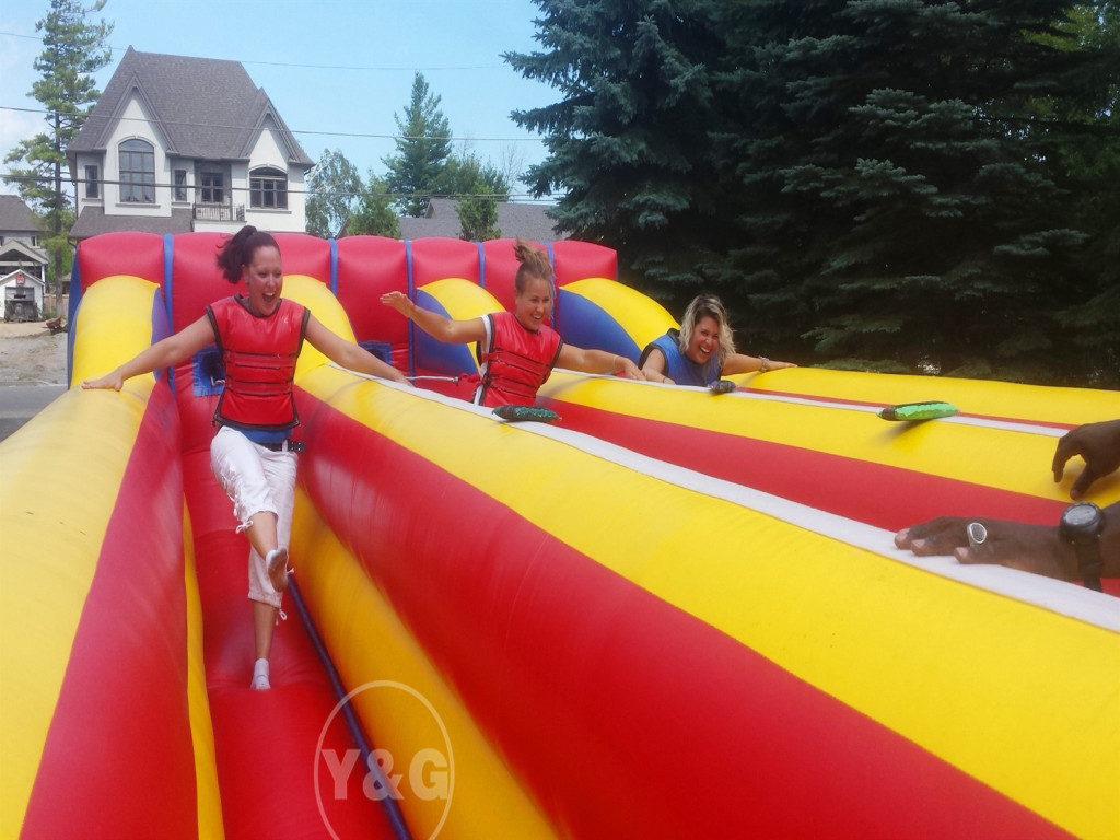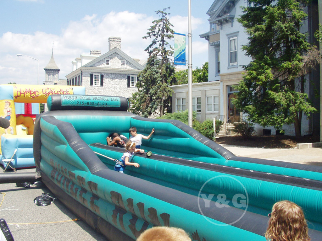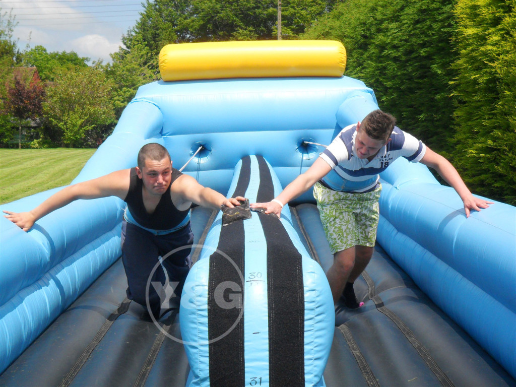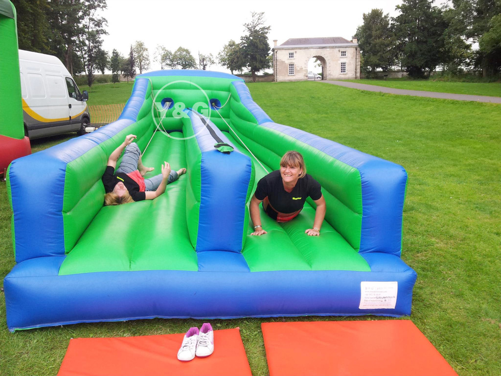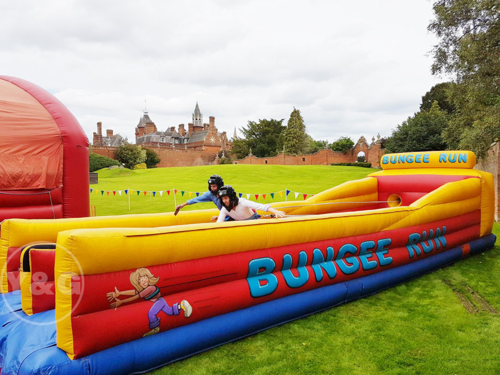 Inflatable Bungee Run is a fun competition between two people.Each competitor gets strapped into a vest which is attached to a giant bungee cord.  The goal is to run as far as possible, and lay your marker on the velcro strip before the bungee'snaps you back to reality'.
