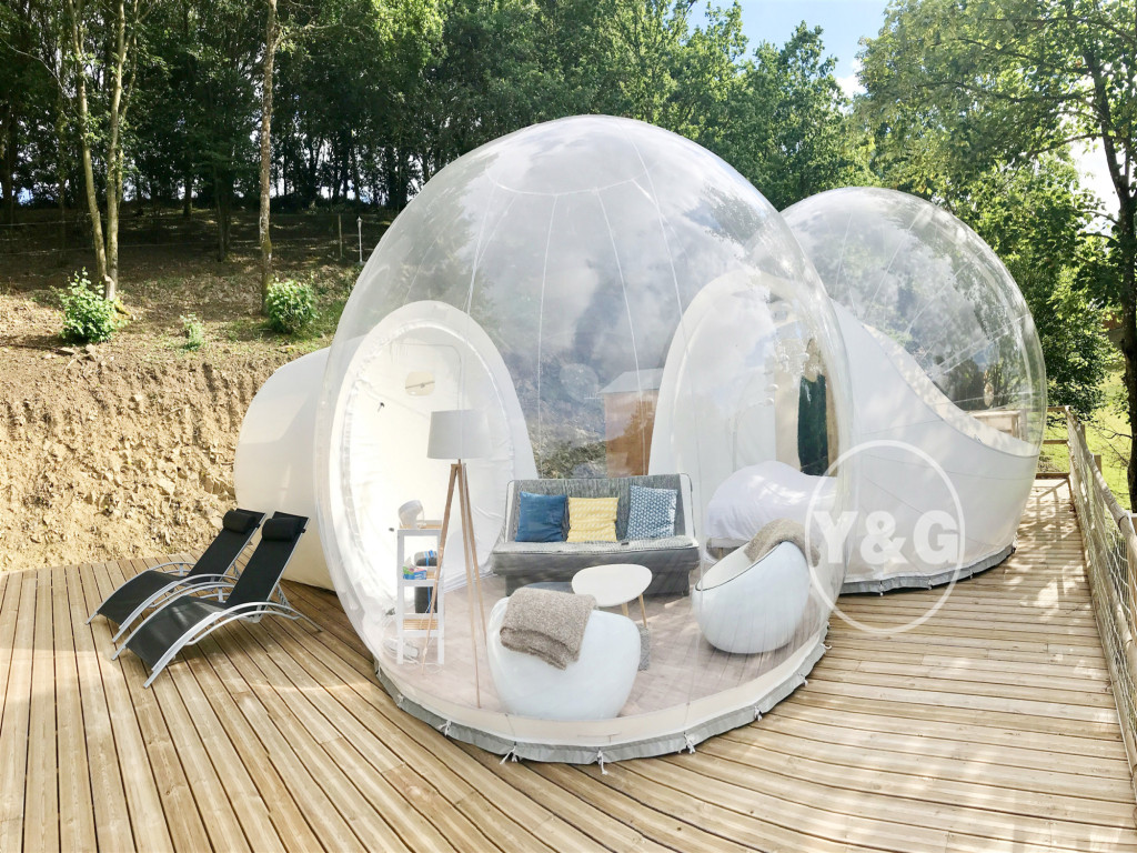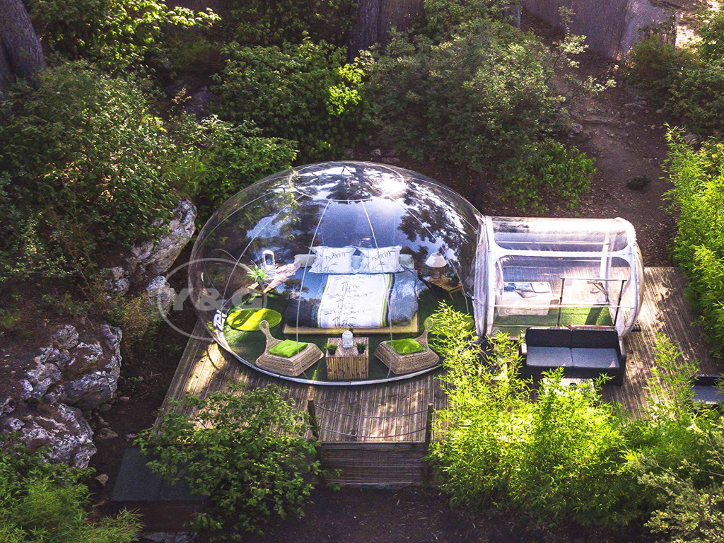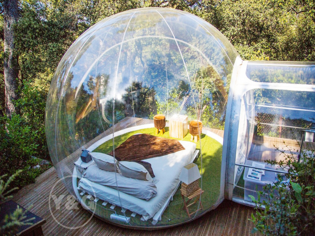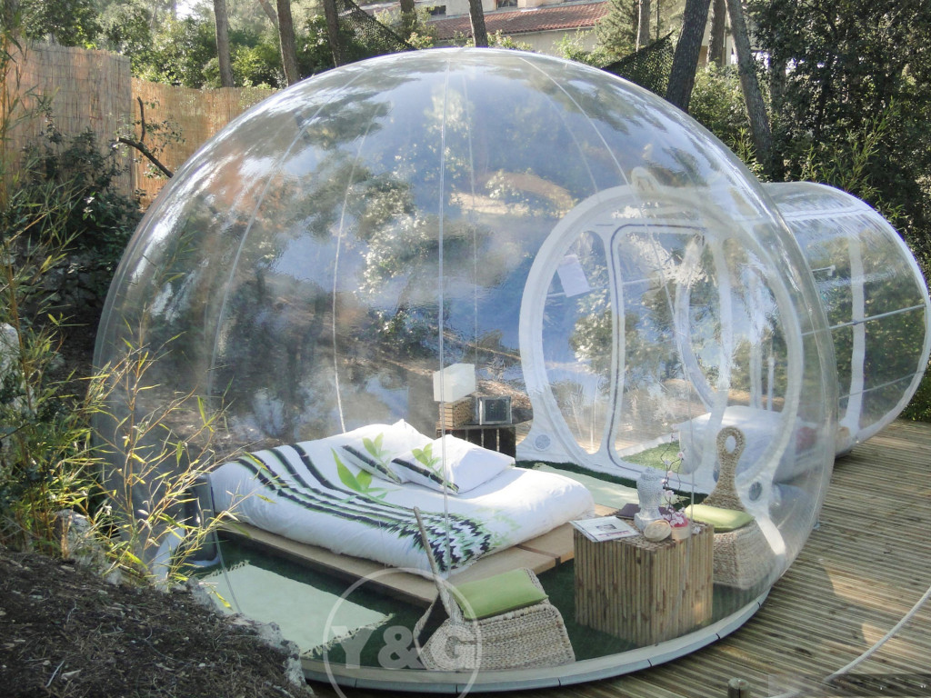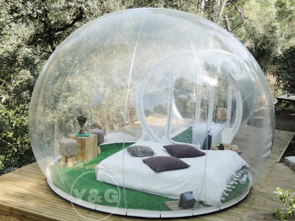 It must be an unforgettable experience to enjoy the beautiful natural scenery and sleep under the tranquil starry sky in this transparent inflatable tunnel bubble tent